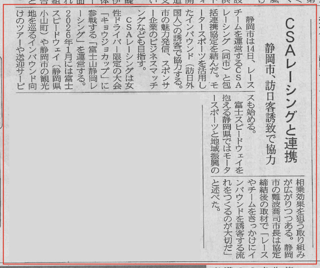 2025年11月14日、富士山静岡レーシングの運営会社であるCSA racingは、静岡市と観光振興や地域活性化を目的とした包括連携協定を締結しました。